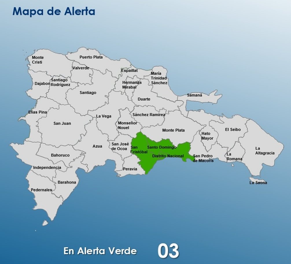 El Centro de Operaciones de Emergencias (COE) mantiene bajo alerta verde las provincias de San Cristóbal, Santo Domingo y el Distrito Nacional, debido a la incidencia de una vaguada que provocará nubosidad con aguaceros fuertes en ocasiones durante la tarde de este sábado.