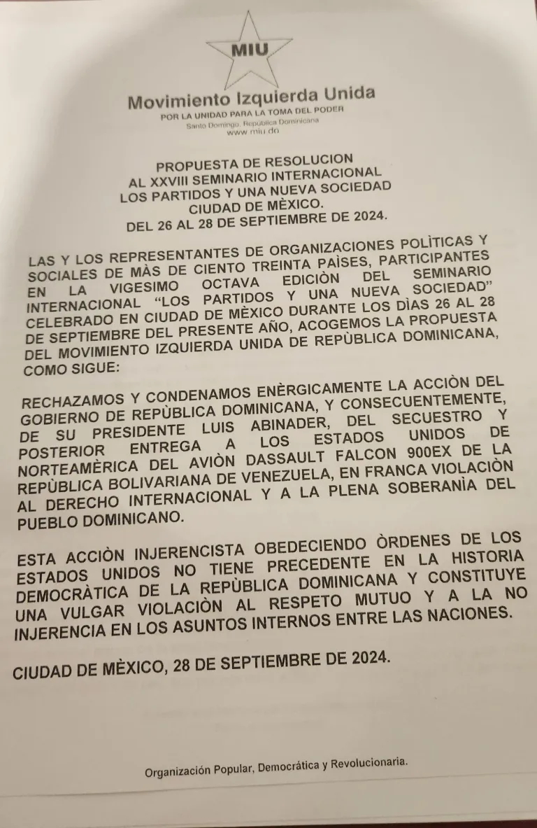 A primeras horas de la tarde de este lunes, se dio a conocer, que más de 500 representantes de más de 130 países reunidos en el XXVII Seminario “Los partidos y una nueva sociedad” condenaron unánimemente la decisión del gobierno de Luis Abinader de entregar un avión del gobierno venezolano a los Estados Unidos.