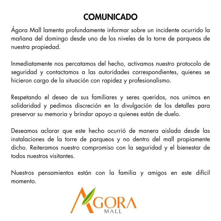 A través de un comunicado, Ágora Mall expresó sus más sinceras condolencias a la familia de Espínola Roques, ofreciendo todo su apoyo en estos difíciles momentos. Además, la administración del centro comercial afirmó que están colaborando con las autoridades en la investigación de los hechos y que las operaciones comerciales continúan con normalidad.