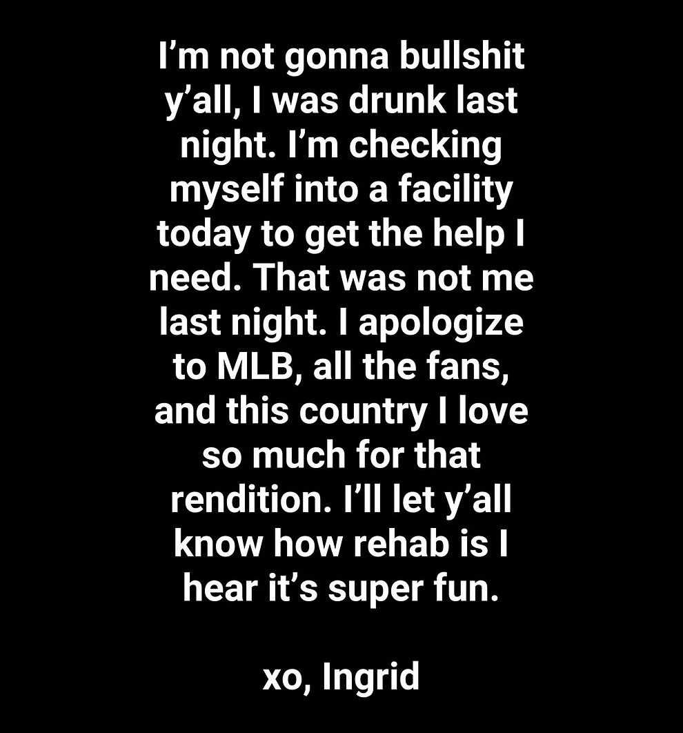 «No voy a mentirles, anoche estaba borracha«, expresó la cantante. «Me registraré en un centro hoy para obtener la ayuda que necesito. Esa no era yo anoche. Pido disculpas a la MLB, a todos los fanáticos y a este país que amo tanto por esa interpretación», agregó.