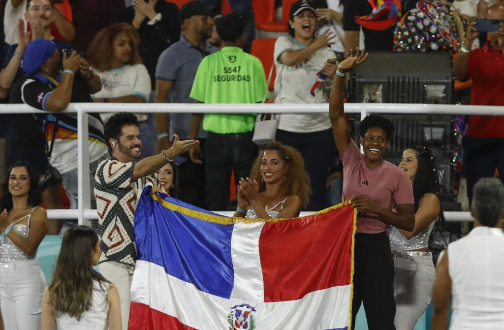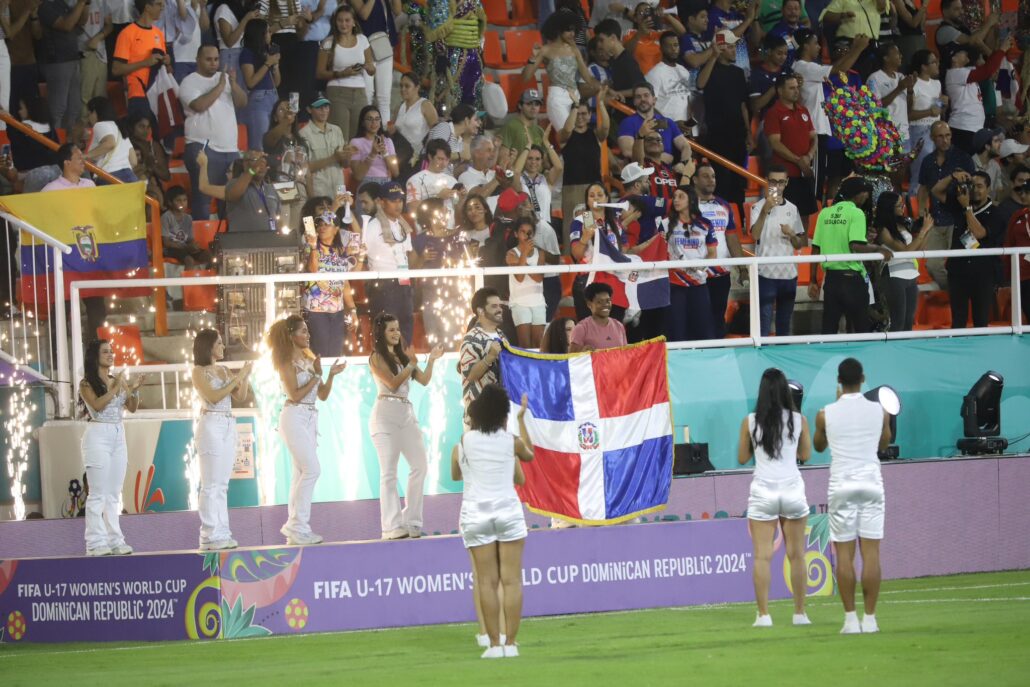 El ambiente festivo se completó con la presencia de jóvenes portando las banderas de las 16 naciones participantes, fuegos artificiales y la participación de los tradicionales «diablos cojuelos» del carnaval dominicano, que aportaron un toque de color y alegría a las gradas.