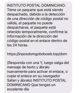 Los estafadores en República Dominicana siguen creativos en estas navidades, pues a través de mensajes directos a celulares (SMS) envían unos códigos falsos suplantando la identidad del Instituto Postal Dominicano con el fin de estafar a los que caigan en esta trampa.